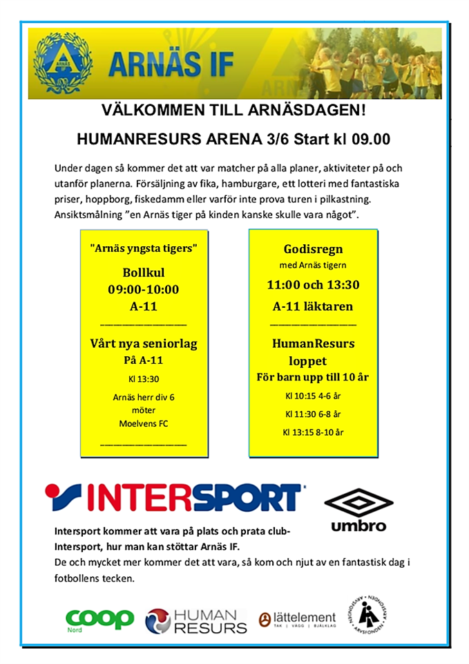 Äntligen dags för Arnäsdagen! När: lördag 3/6 Tid: ca 09-15.30 Ta med familjen, släkt och vänner och ha en heldag bland spännande fotbollsmatcher, lotteri, pilkastning, burkkastning hoppborg, hamburgeri, kiosk mm. Karta över området Intersport och Umbro kommer att vara på plats med tävlingar och bra erbjudanden. Här finnas alla matcher under dagen Matcher Arnäsdagen För de yngsta mellan 4-10 år har vi i år en rolig springnyhet, 3st minilopp som arrangeras i samarbete med HumanResurs. Anmälan görs på plats, alla får en belöning vid målgång! I inbjudan hittar ni mer info ang tider för miniloppen. Inbjudan Det är begränsat med parkeringsmöjligheter iår eftersom vi har det spännande projeketet med konstgräs som ska läggas på vår stora grusplan. Därför vill vi gärna tipsa er om att lämna bilen hemma och promenera, cykla eller ta bussen .Så sparar vi på miljön också! Sprid infon om Arnäsdagen bland vänner och bekanta, och hoppas vi får en fantastisk rolig dag tillsammans nere på HumanResurs Arena! Välkommen! Arnäs IF