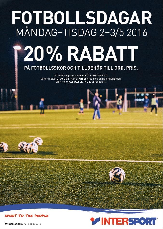 Den 2-3/5 är det fotbollsdagar på Intersport. 20 % rabatt på fotbollskor och tillbehör. Vi rekommenderar alla medlemmar som ska beställa nya team-kläder att gå in och prova dessa under de här två dagarna.