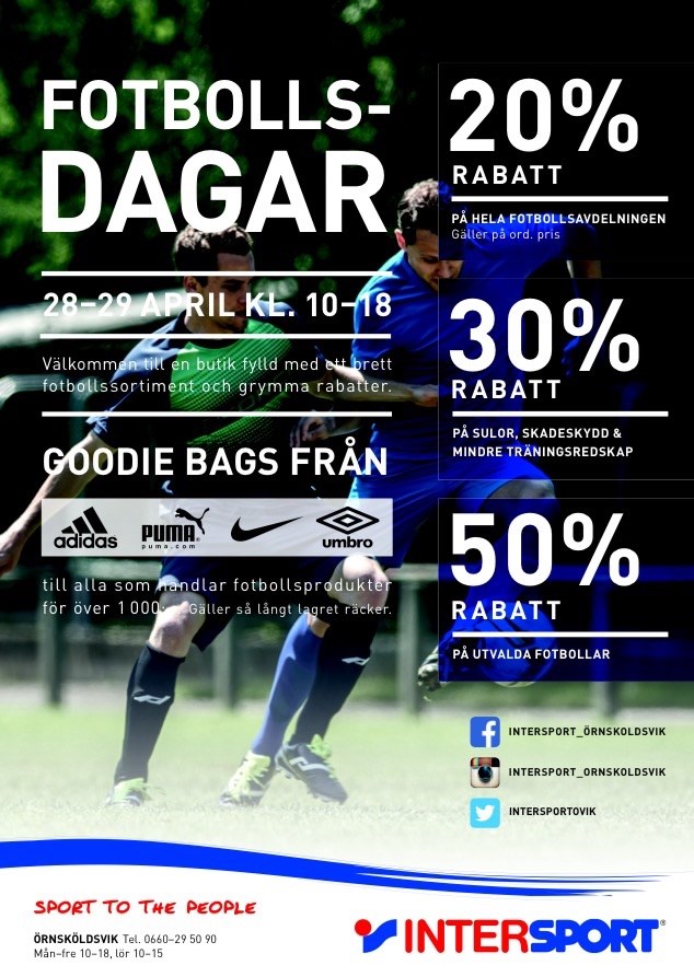 Fotbollsdagar 28-29 april har Intersport fotbollsdagar med bra priser. Bland annat 20% rabatt på hela fotbollsavdelningen.